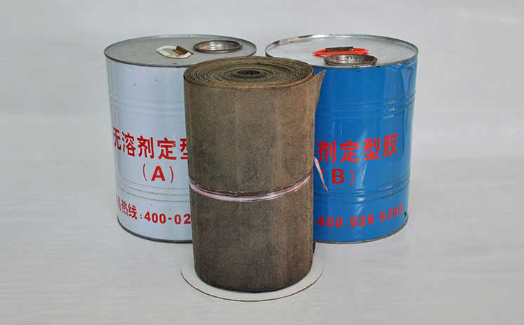 5、涂膠和鋪纏帶:把配比攪拌好的定型膠用干凈毛刷或滾刷均勻足量涂敷一遍,確保無漏涂后即可鋪纏基帶,按20~25mm寬度搭接,延長(zhǎng)搭接100~150mm,疊層/搭接處涂刷定型膠,附平拉緊,不得出現(xiàn)鼓包。